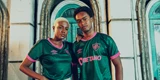 Further details include a V-neck collar and trims popped in pink. There is also a special sign-off featuring a drawing of the artist wearing a Fluminense shirt and "Mestre Cartola" surrounding him.